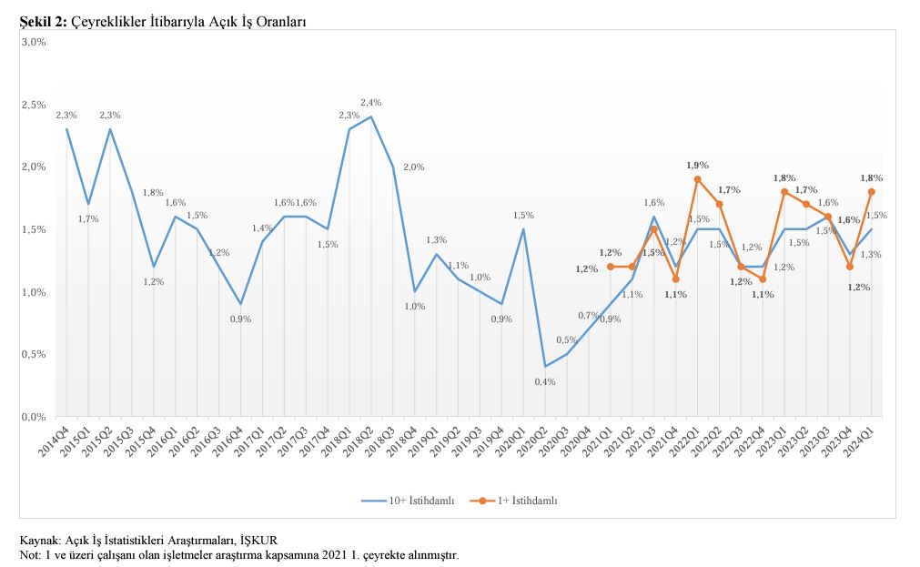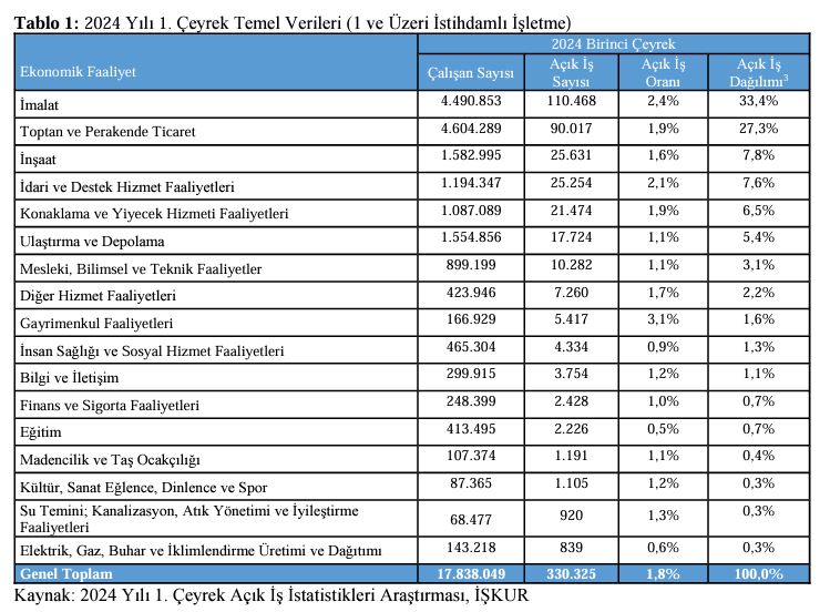 Araştırma kapsamında 19-29 Şubat 2024 tarihleri arasında Türkiye genelinde örneklemde yer alan 1 ve üzeri çalışanı olan 17 bin 181 işletme ile iletişime geçildi. Söz konusu işletmelerden 14 bin 683’üne (yüzde 85,5) soru formu uygulandı. Bu bağlamda, Türkiye genelinde 3 milyon 285 bin 784 işletmeyi kapsayan veri derlendi. Buna göre; 2024 yılı 1’nci çeyreğinde Türkiye genelinde işletmelerde toplam 330 bin 325 açık iş olduğu tespit edildi. 1-9 çalışanı olan işletmelerde toplam 170 bin 440 açık iş, 10 ve daha fazla çalışanı olan işletmelerde ise 159 bin 885 açık iş olduğu görüldü. Açık iş sayısı, 1 ve daha fazla çalışanı olan işletmelerde bir önceki yılın aynı dönemine kıyasla yüzde 0,2 oranında azaldı. Açık işlerin 1 ve daha fazla çalışanı olan işletmelerde geçen yılın aynı dönemine göre, en çok azaldığı sektörlerin başında imalat, mesleki, bilimsel ve teknik faaliyetler ile bilgi ve iletişim sektörleri geldi.